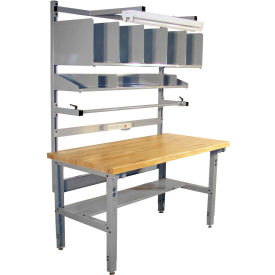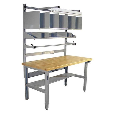 This packing workbench has an overall dimension of 60W x 30D x 30 - 36H. Light gray frame with heavy duty 1-3/4 thick maple eased edge surface. Above surface accessories are adjustable on the uprights. Work surface height adjusts from 30 to 36 high. This product has a limited warranty of 1 year. Includes: Half width lower shelf Uprights Bin holder 6 outlet power strip 12 cantilever shelf with 4 dividers 18 deep shelf with 4 dividers Overhead shop light Hardware included Solid Maple Work Surface Cleaning: For best results, clean finished butcher block surfaces with soapy water or commonly available kitchen counter top cleaners. Do not use abrasives or powder cleansers. Do not allow moisture to stand on the surface for prolonged periods of time. Product Details Leg Type Adjustable Assembly Required Yes Edge Type Square Number of Shelves 3 Type Preconfigured Workbench Top Material Maple Butcher Block Package Quantity 1 Leg Style Square Tubular Leg Material Steel Warranty 1 yr Style Packing Bench W/ Power Outlets Top Color Family Maple Color Family Gray Weights & Dimensions Depth 30 in Width 60 in Top Thickness 1-3/4 in Height 30 to 36 in Weight Capacity 750 lbs Weight 124 lbs