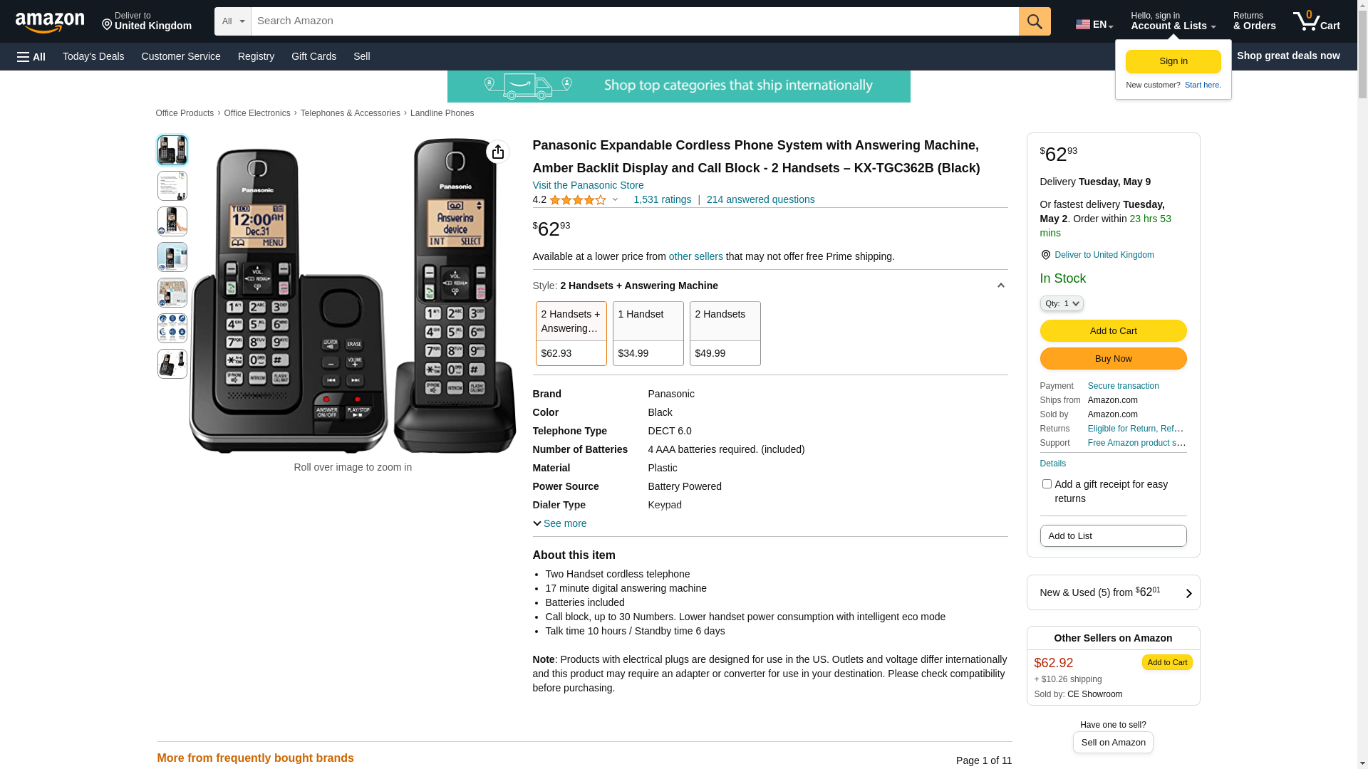 The Panasonic KX-TGC362B Dect 6.0 plus expandable digital Cordless Answering system, with 2 Handsets, can handle up to six Handsets on the same line (additional Handsets sold separately). this KX-TGC362B takes on all of your day-to-day communication needs with an all-digital Answering system, call waiting caller ID, call block, silent mode, and more. This energy star unit has Intelligent eco mode which automatically lowers the power consumption when you're using the Handset close to the base unit. Dect 6.0 plus technology takes superb sound quality and outstanding range to a whole new level. And with the Handset locator, you'll never lose track of your Handset again.