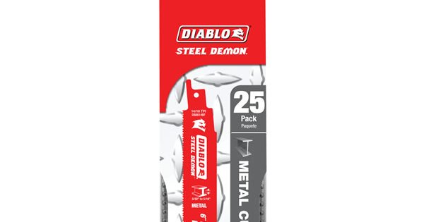 The Diablo Steel Demon Metal Cutting reciprocating saw blade is specifically designed for maximum performance in metal cutting applications. The blade's ultra-hardened cutting edge delivers up to four times longer life than those of standard blades. Dual Tooth design features a double tooth configuration with small gullets for faster material removal and extra durability. Blade Size in. 6, Blades qty. 25, Blade Material Steel, Tang Style Universal, TPI Teeth per Inch 14/18, Blade Application Metal cutting, Blade Type Straight back. Pack of 25 blades For cutting metals 3/32in. to 5/16in. thick Perma-SHIELD coating protects the blade from heat, gumming, and corrosion 1in. demolition body for straighter cuts with less vibration Ultra-hardened edge increases the hardness of the cutting edge to a Rockwell hardness of HRC 62 versus HRC 55 for standard blades One-of-a-kind tip design enables faster and easier plunging