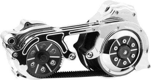 Features a two-piece motor plate design and 2in. primary belt.<br> 52/69 pulley combination for a 1.32:1 final drive ratio.<br> Belt profiles are unique to each kit, requiring matched pulleys for each belt; pulleys may not be interchanged.<br> Front pulley face and spring collar have a matching pattern to the rear pulley.<br> Front pulley cover is counter-bored for a super-clean appearance.<br> Diaphragm clutch is a 6-bolt configuration for a more firm feel and improved appearance.<br> Kits include side and top guard for an aggressive, open dome look.<br> Springs and spring collar are enhanced for more positive lock-up engagement, great for big-inch/ high-horsepower motors.<br> Ball bearing pressure plate.<br> Made in the U.S.A..