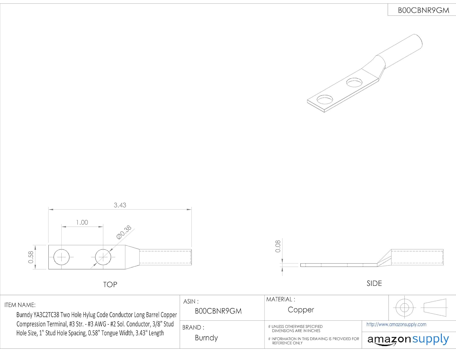 | Feature | <b>Price For:</b> Each <b>Peep Hole</b>: No <b>Connector Type</b>: Straight Barrel <b>Material</b>: Copper <b>Plate Material</b>: Electro Tin <b>Standards</b>: UL Listed, CSA Certified, UL467 <b>Barrel Length</b>: Long <b>Length</b>: 3.43" <b>Item</b>: Two-Hole Lug Compression Connector <b>Hole Center to Center</b>: 1.000" <b>Cable Size</b>: 3 AWG <b>Stud Size</b>: 3/8" <b>Lug Compression Connector Type</b>: Two-Hole Lug Compression Connector <b>Die Code</b>: 9 |