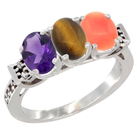 14K White Gold Natural Amethyst, Tiger Eye & Coral Ring 3-Stone 7x5 mm Oval Diamond Accent, sizes 5 - 10