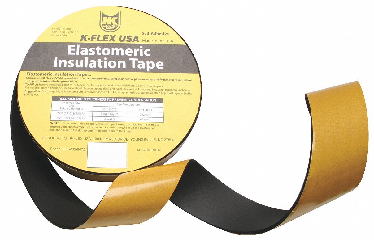- Price For: Each Includes: Pressure Sensitive Adhesive And Release Liner For Use On: Cold Water Plumbing, Chilled Water, Refrigeration Lines, Hot Water Plumbing, Liquid Heating, and Dual Temperature Piping Standards: ASTM E84 25/50, NFPA 90A/B Material: NBR/PVC Color: Black Width: 2" Length: 30 ft. Item: Pipe Insulation Tape Temp. Range: -40 Degrees to 220 Degrees F