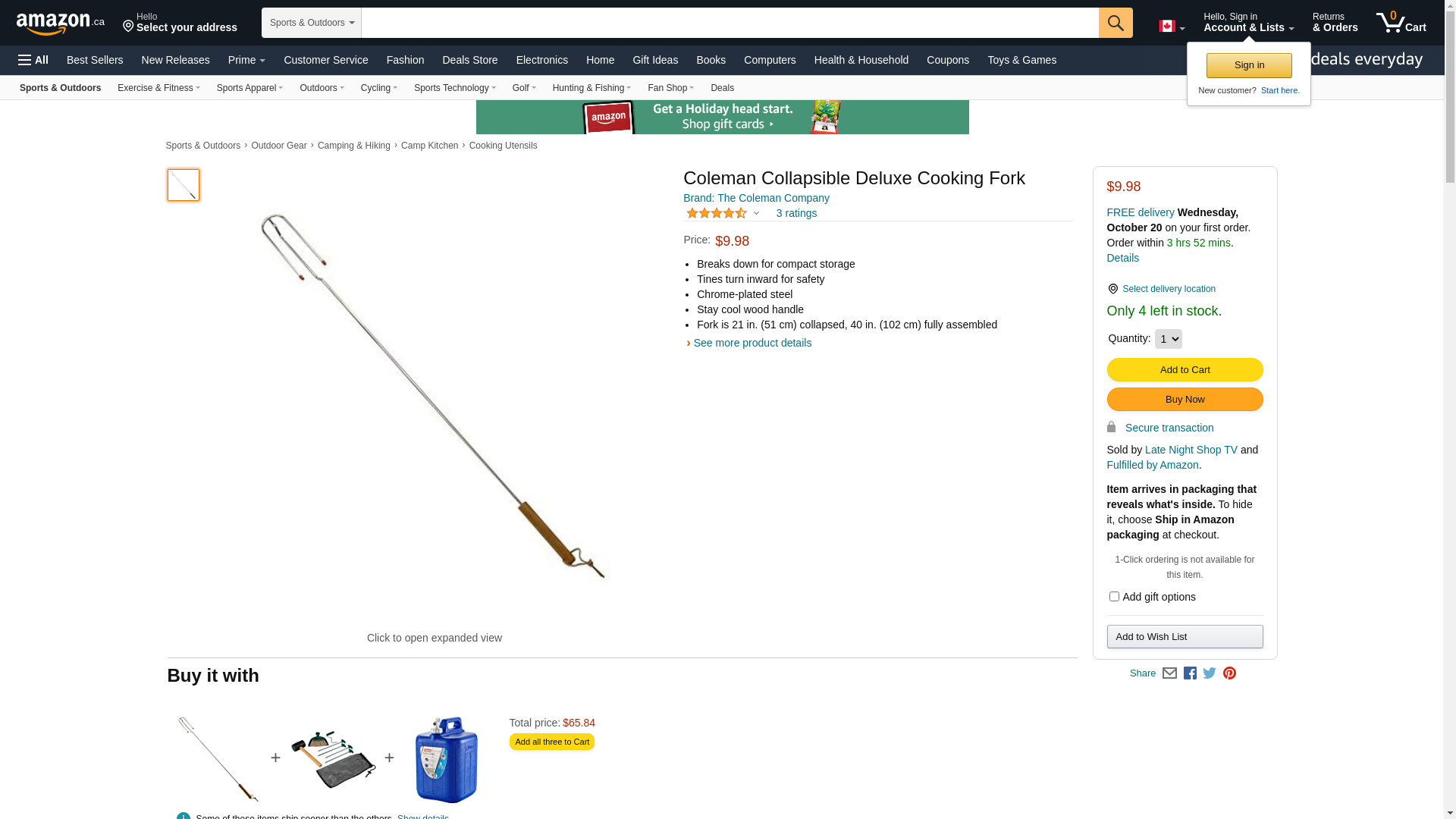 | Feature | Be the toast of the campground with this collapsible cooking fork from the camping experts at Coleman. From its broken down length of 21", this cooking fork expands to a full length of 40". It has a wooden handle to keep your hands cool while cooking over an open fire and its tines are turned inward for safety. Great for kebabs, hot dogs, marshmallows, and anything else you can cook on a stick. |