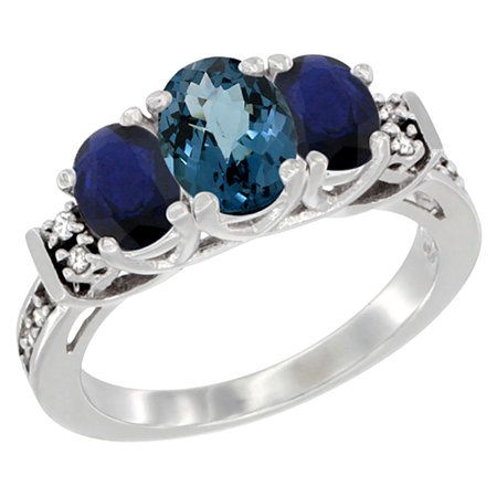 10K White Gold Natural London Blue Topaz & Blue Sapphire Ring 3-Stone Oval Diamond Accent