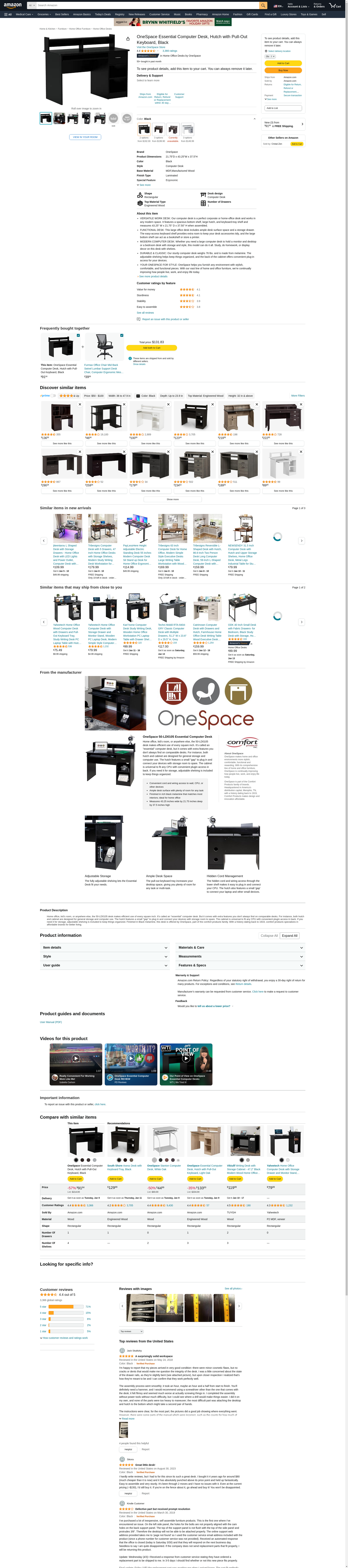 OneSpace Essential Computer Desk, Hutch with Pull-Out Keyboard, Black