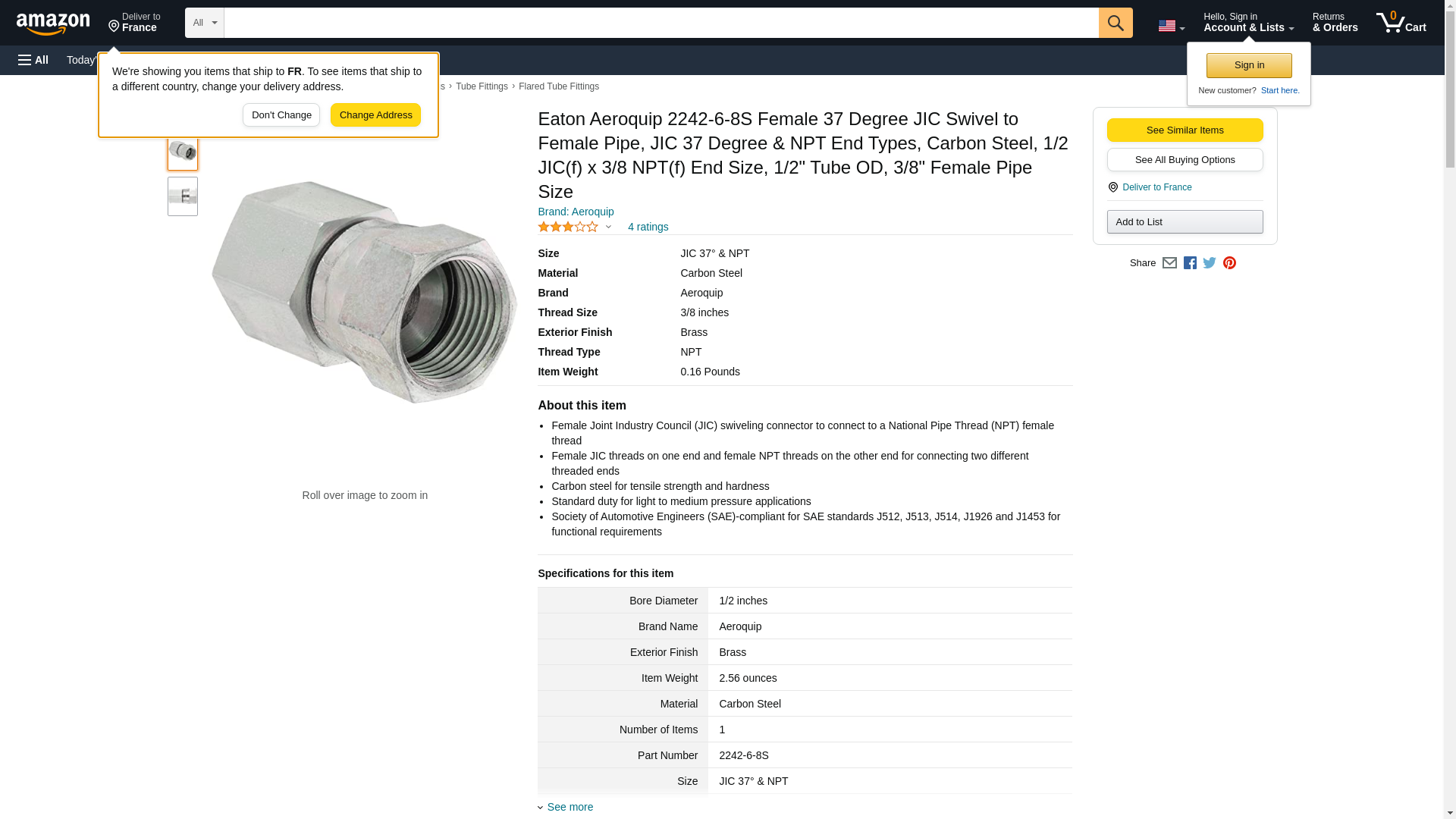 Eaton Aeroquip 2242-6-8S Female 37 Degree JIC Swivel to Female Pipe, JIC 37 Degree & NPT End Types, Carbon Steel, 1/2 JIC(f) x 3/8 NPT(f) End Size, 1/2" Tube OD, 3/8" Female Pipe Size