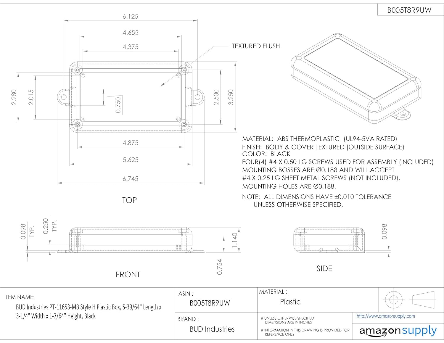| Feature | <b>Price For:</b> Pack of 10 <b>Manufacturer</b>: Bud Industries <b>Product Category</b>: Enclosures, Boxes, & Cases <b>RoHS</b>: <b>Brand</b>: Bud Industries <b>Material</b>: Plastic (ABS) <b>Product</b>: Boxes <b>Length</b>: 28.45 mm <b>Width</b>: 82.55 mm <b>Height</b>: 144.78 mm <b>Color</b>: Black <b>Features</b>: Available With Molded-In External Wall Mounting Brackets <b>Flammability Rating</b>: UL 94 5VA <b>Packaging</b>: Bulk <b>Unit Weight</b>: 3.700000 oz |