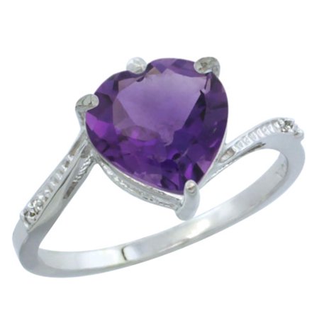 14K White Gold Natural Amethyst Ring Heart 9x9mm Diamond Accent, sizes 5-10