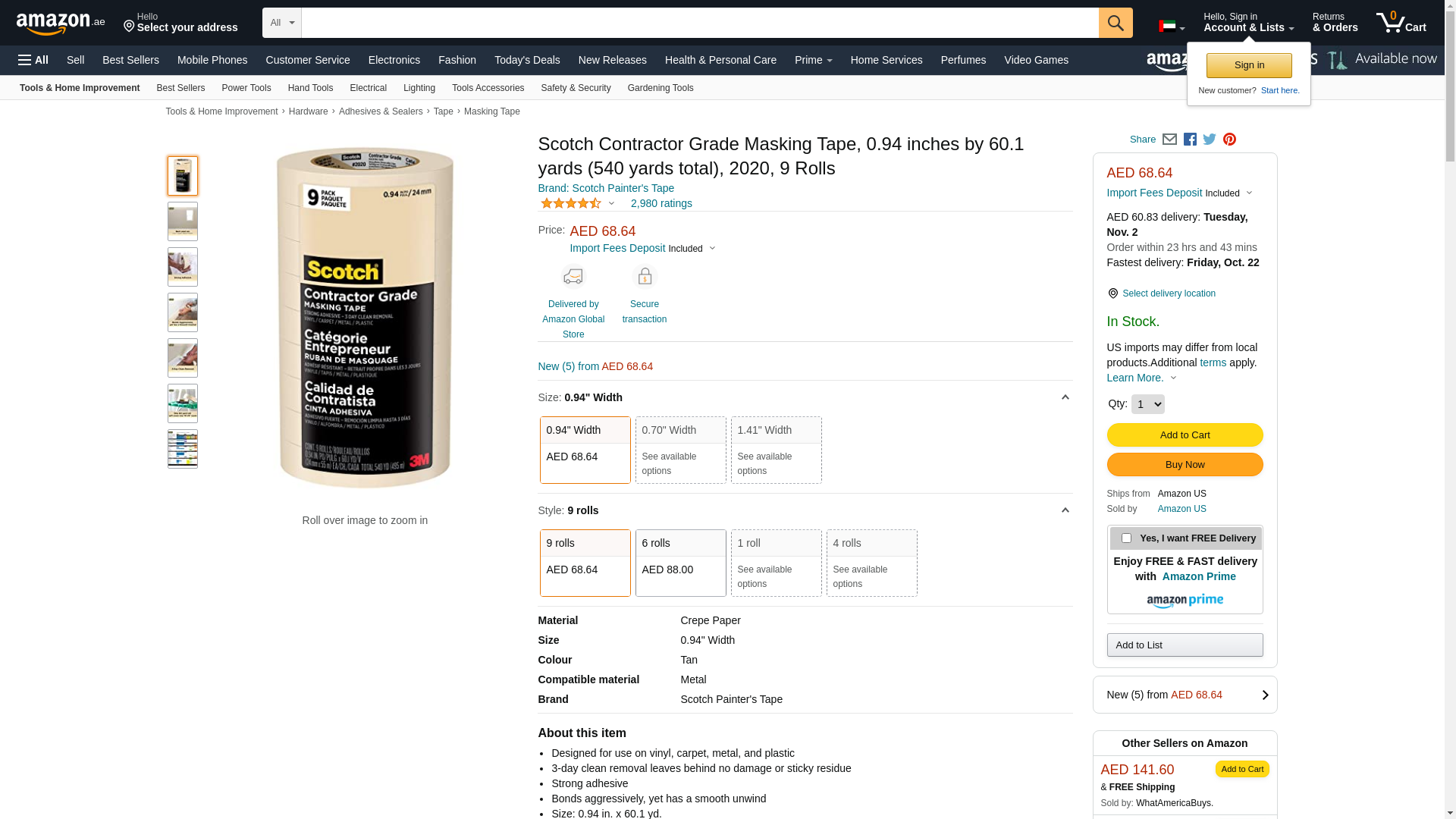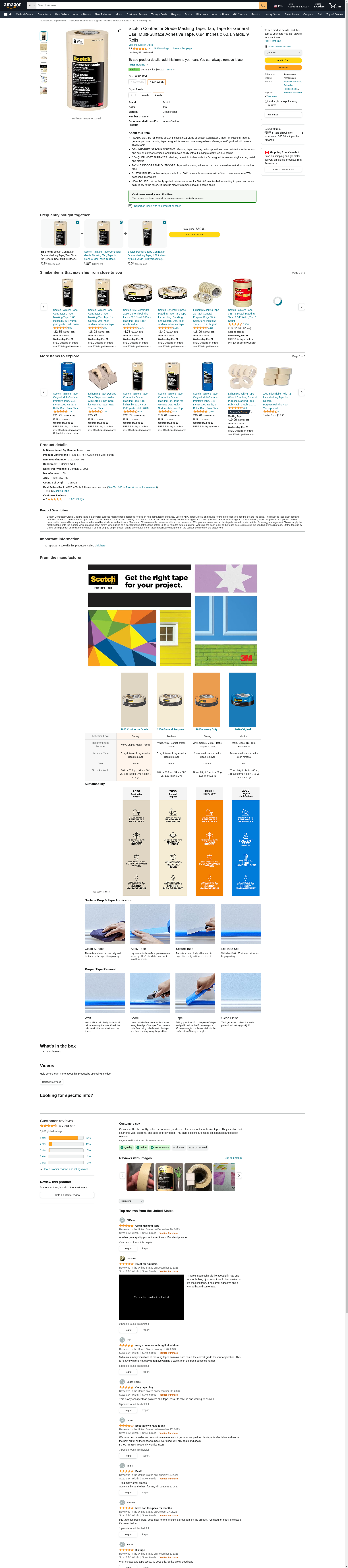 Scotch Contractor Grade Masking Tape, 0.94 inches by 60.1 yards (540 yards total), 2020, 9 Rolls