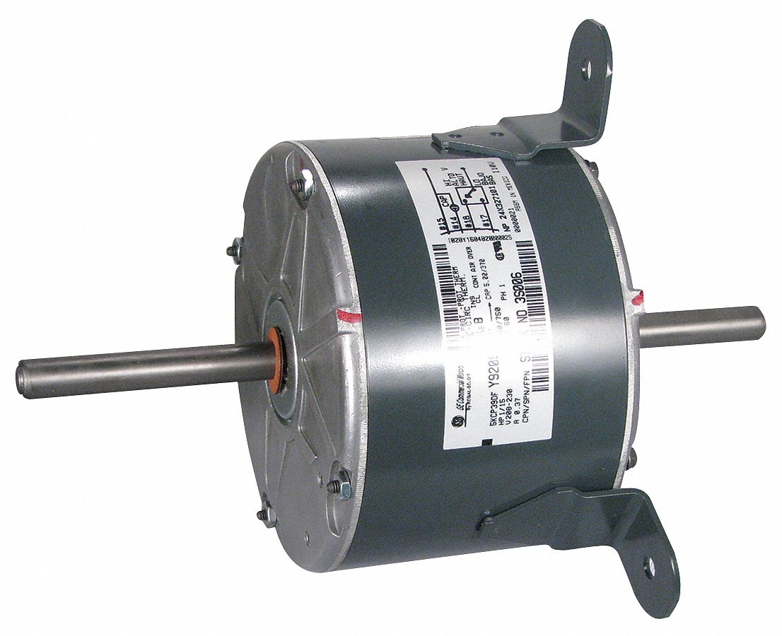 'Packaged Terminal Air Conditioner Motor, Permanent Split Capacitor, Totally Enclosed Nonventilated, 1/15 HP, Nameplate RPM 850/750, Voltage 208-230, Full Load Amps 0.37, NEMA Frame 48, Service Factor 1.0, 60 Hz, Lug Mounting, Sleeve Bearings, Auto Thermal Protection, Rotation CWLE, Insulation Class B, Ambient 40 C, Number of Speeds 2, Shaft Dia 1/2 In, Shaft Length 3-1/4 & 3 In, Length Less Shaft 7-3/16 In, Capacitor Required G3303352, Replaces Goodman G06305859DFY920S, GE G06305859DFT606AS'