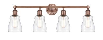 INNOVATIONS 616-4W-AC-G392 Ellery 4 31.75 inch Bath Vanity Light Antique Copper. Style: Nautiical, Art Nouveau, Transitional, Modern . Collection Name: Edison. Metal Finish(Body): Antique Copper. Metal Finish(Canopy/Backplate): Antique Copper. Material: Steel, Cast Brass, Glass. Dimension(in): 11.5(H) x 31.75(W) x 6.875(Ext). Bulb: (4)60W Medium Base Incandescent(Not Included). Voltage: 120. Dimmable: Yes. Color Temperature (Kelvin): 2200. Color Rendering Index (CRI): 99.9. Lumens: 220. Life Expectancy (Hours): 2000. Glass Shade Description: Clear Ellery. Glass Type: Transparent. Shade Shape: Bell/Urn. Glass or Metal Shade Color: Clear. Shade Material: Glass. Shade Dimension(in): 4.75(W) x 6(H). Fitter Measurement (Glass Or Metal Shade Fitter Size): Neckless with a 1.75 inch opening. Backplate Dimension(in): 4.5(W) x 0.75(Depth). ADA Compliant: No. California Proposition 65 Warning Required: Yes. UL/ETL Certification Type: Damp Location.