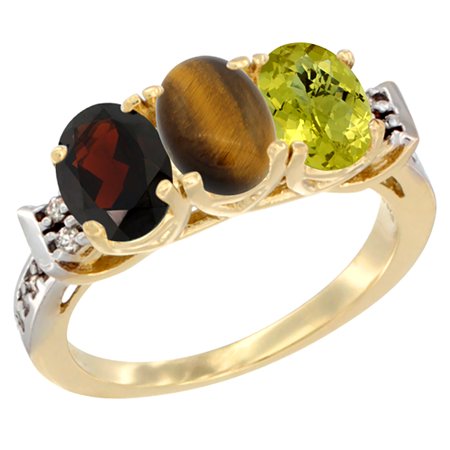 14K Yellow Gold Natural Garnet, Tiger Eye & Lemon Quartz Ring 3-Stone 7x5 mm Oval Diamond Accent, sizes 5 - 10