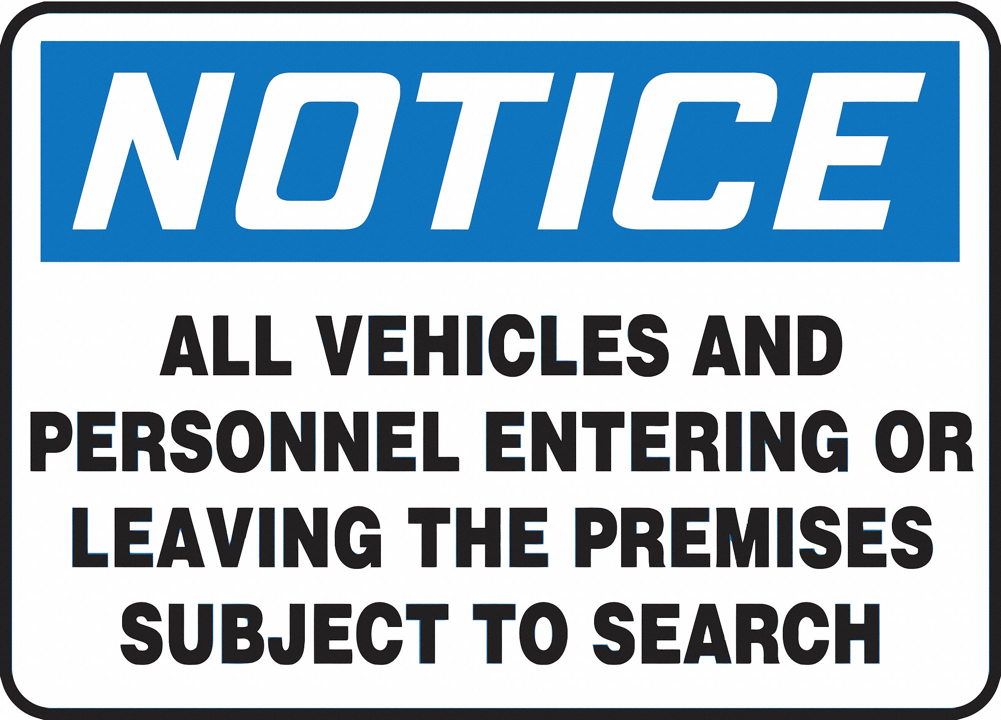 Accuform MADM993VP Sign, Notice All Vehicles and Personnel Entering OR Leaving The Premises Subject", 7" Length x 10" Width x 0.055" Thickness, Plastic, 7" x 10", Blue/Black on White