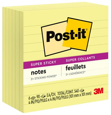 Post-it Super Sticky Notes, 4x4 in, 6 Pads, 2x the Sticking Power, Canary Yellow, Recyclable (675-6SSCY)