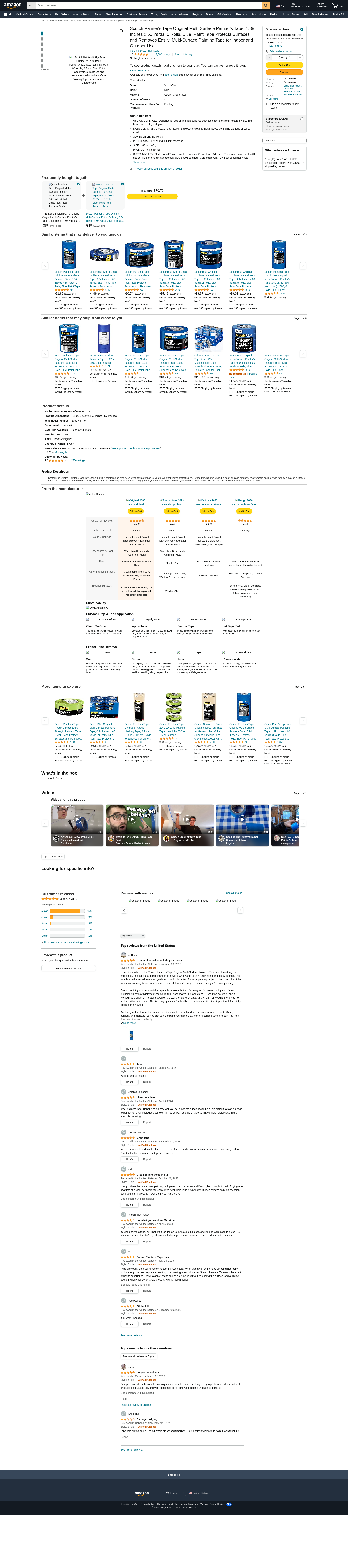 Scotch Painter's Tape Original Multi-Surface Painter's Tape, 1.88 Inches x 60 Yards, 6 Rolls, Blue, Paint Tape Protects Surfaces and Removes Easily, Multi-Surface Painting Tape for Indoor and Outdoor Use