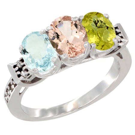 10K White Gold Natural Aquamarine, Morganite & Lemon Quartz Ring 3-Stone Oval 7x5 mm Diamond Accent, sizes 5 - 10