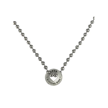<ul> <li>Pendant measures 2.5 centimeter diameter</li> <li>18 inch ball chain</li> <li>Heart cut out in pendant</li> </ul>