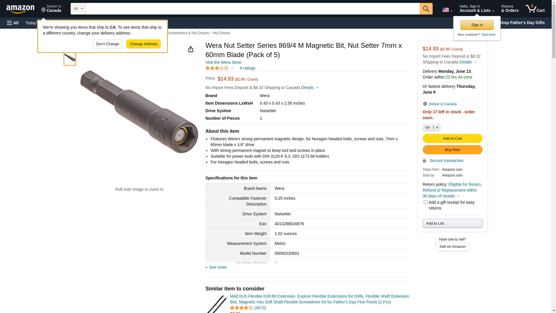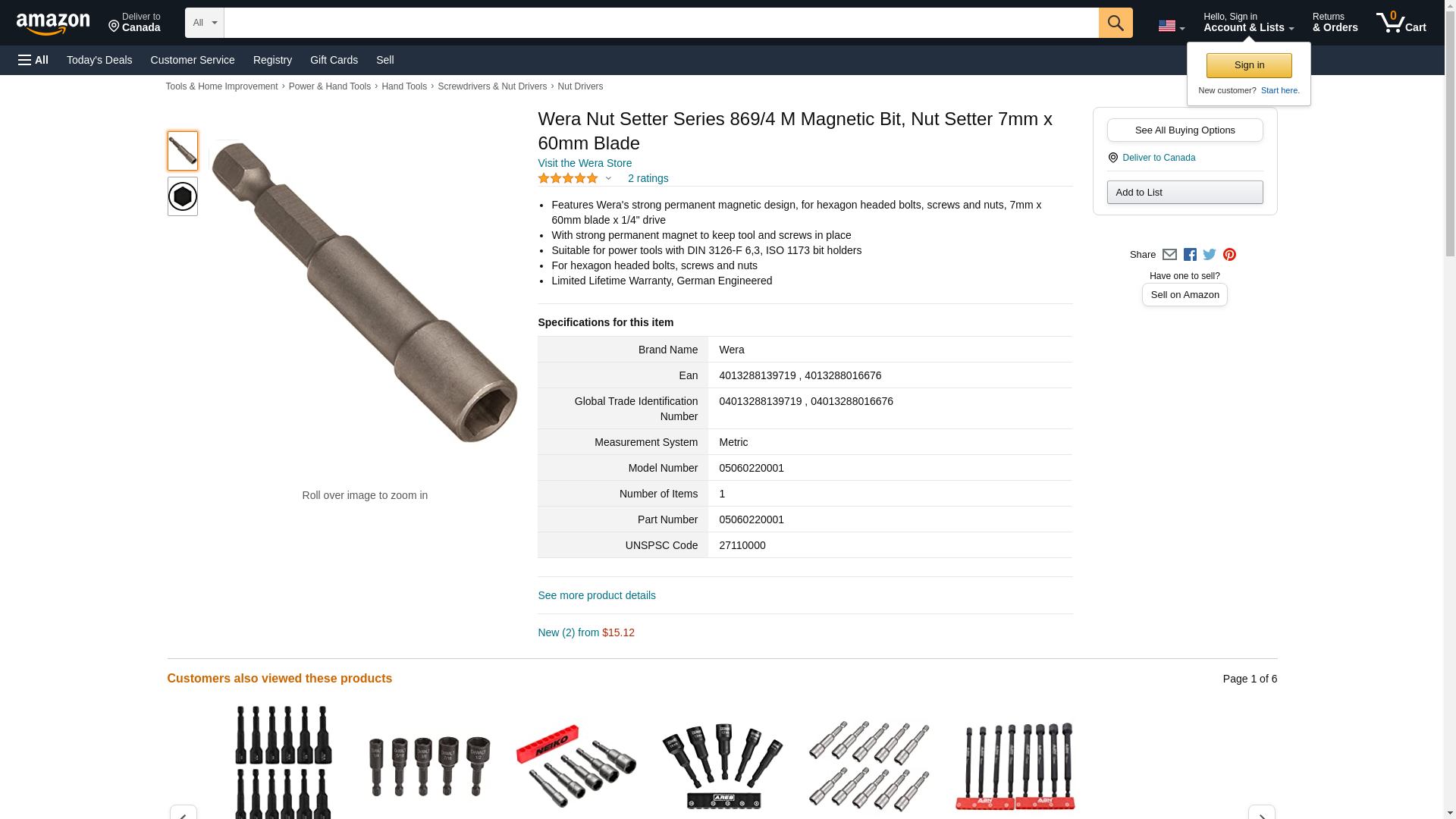 | Feature | Features Wera\'s strong permanent magnetic design, for hexagon headed bolts, screws and nuts, 7mm x 60mm blade x 1/4" drive |