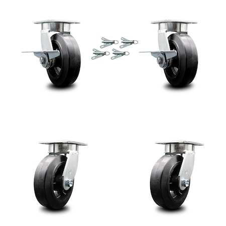 Kingpinless Rubber on Cast Iron Swivel Top Plate Caster Set 4 w/6" x 2" Black Wheels-Includes 2 Swvl w/Brakes and Bolt on Swvl Lcks& 2 Swvl w/Bolt on Swvl Lcks-1800lbs Total Cpty- Service Caster Brand