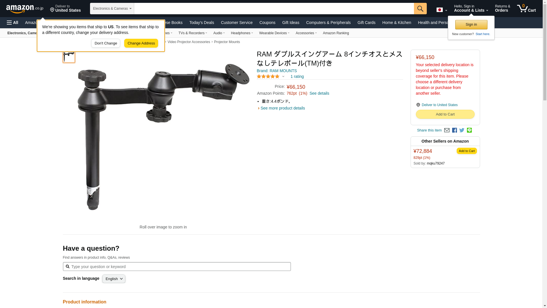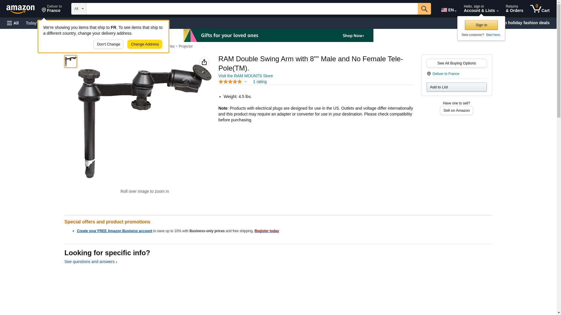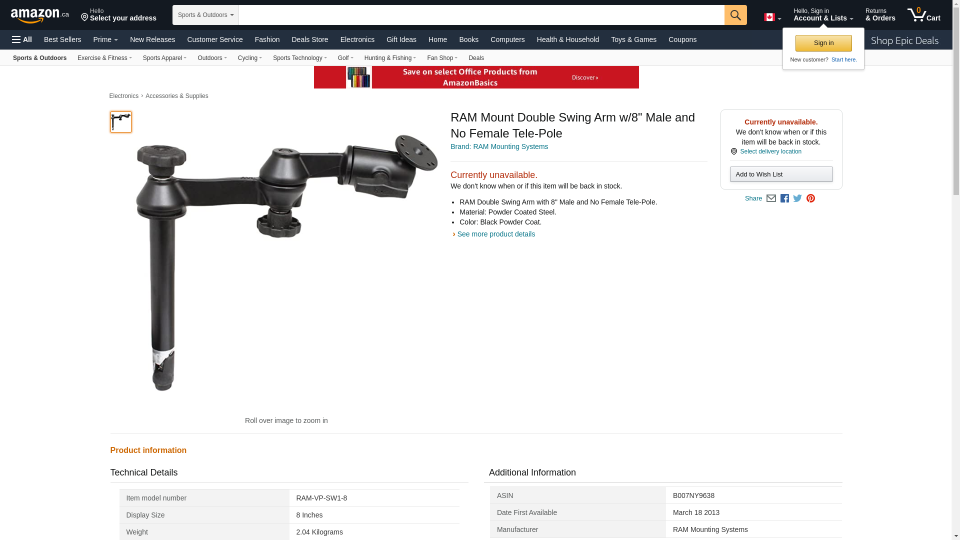 RAM Double Swing Arm with 8" Male and No Female Tele-PoleMaterial: Powder Coated SteelColor: Black Powder Coat