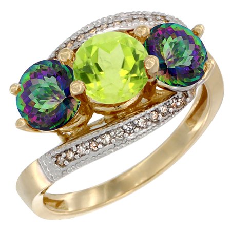 14K Yellow Gold Natural Peridot & Mystic Topaz Sides 3 stone Ring Round 6mm Diamond Accent, sizes 5 - 10