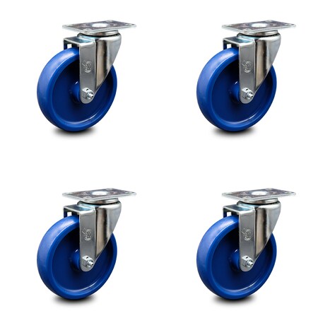 Solid Polyurethane Swivel Top Plate Caster Set of 4 w/5" x 1.25" Blue Wheels - Includes 4 Swivel - 1200 lbs Total Capacity - Service Caster Brand
