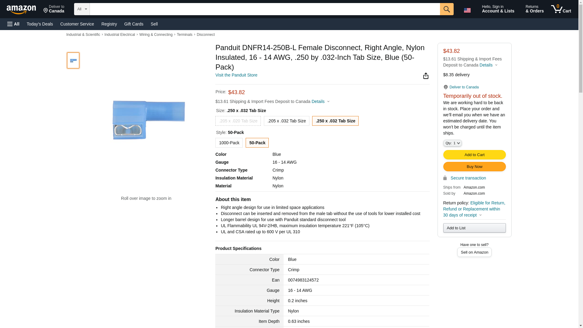 Panduit DNFR14-250B-L Female Disconnect, Right Angle, Nylon Insulated, 16 - 14 AWG, .250 by .032-Inch Tab Size, Blue (50-Pack)