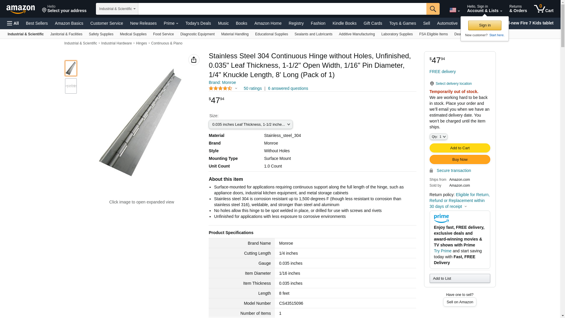- Price For: Each Pin Material: 304 Stainless Steel Pin Type: Removable Hardware: Not Included Finish: Mill Finish Ligature Resistant: No Item: Piano Hinge Material: 304 Stainless Steel Holes: Without Color: Natural Holes per Leaf: 0 Mounting: Full Surface Pin Dia.: 3/32" Range of Motion: 270 Degrees Leaf Thickness: 0.040" Length: 8 ft. Width: 2"
