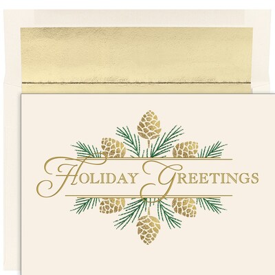JAM PAPER Christmas Cards & Matching Envelopes Set, 7 6/7" x 5 5/8", Golden Pinecones, 16/Pack (5269 | Quill.com