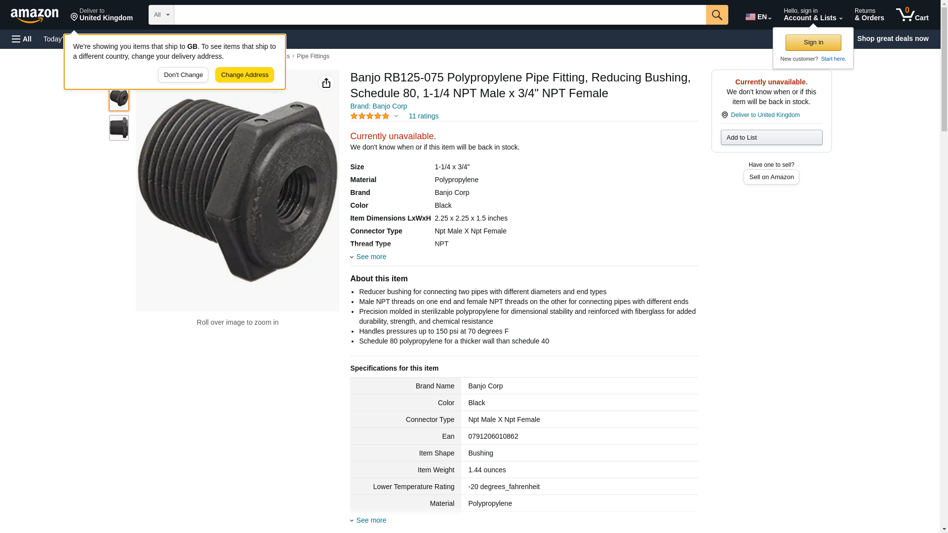 Banjo RB125-075 Polypropylene Pipe Fitting, Reducing Bushing, Schedule 80, 1-1/4 NPT Male x 3/4" NPT Female