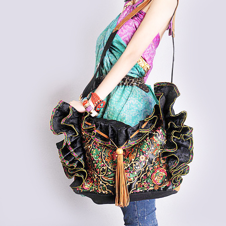 CET Domain SZ10-2003 Hmong Design Nubuck Leather Hand-Beaded Bag Embroidered Flowers