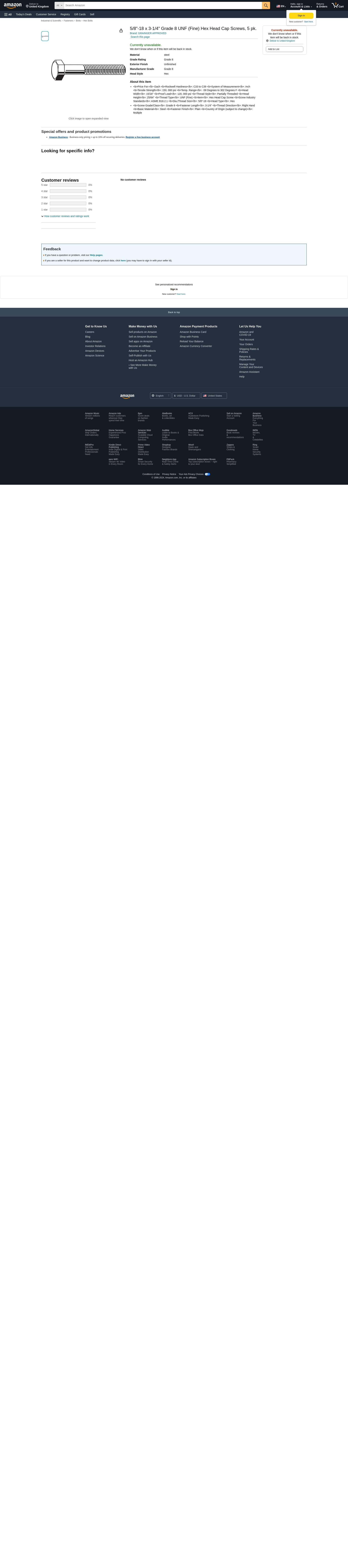 5/8"-18 x 3-1/4" Grade 8 UNF (Fine) Hex Head Cap Screws, 5 pk.