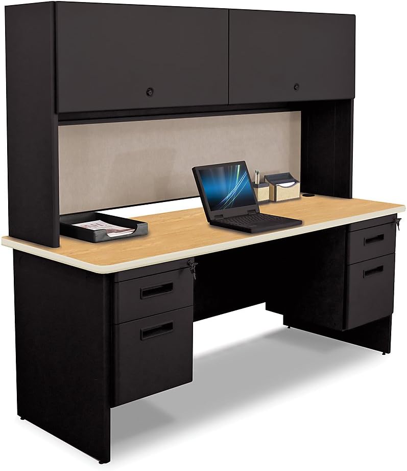 Solid steel construction and durable laminate desk top makes this MARVEL Pronto Office Desk the perfect combination of style and functionality. 1-1/8" thick scratch-resistant melamine laminate desk top includes attractive radius edge. Two 2" grommets with plastic covers help you keep computer cords neat and organized. Steel supports have adjustable glides to steady desks on uneven floors. Pedestals feature a box drawer and high-sided file drawer that extend fully on ball-bearing slides. Central locking system secures contents. Sturdy steel frame construction with tough textured powder coat finish for easy care. Meets or exceeds ANSI/requirements. Ships within 5 days.
