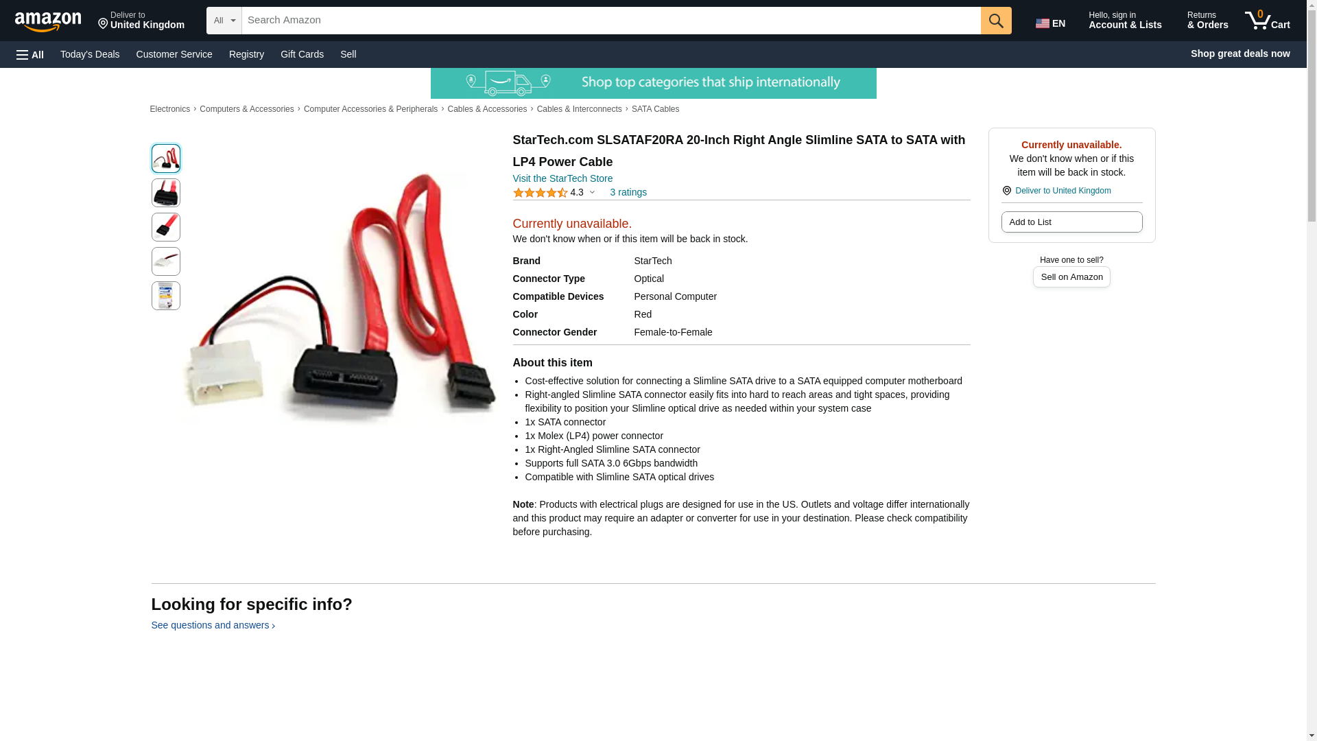 | Feature | STARTECH SLSATAF20RA 20INCH RIGHTANGLE SLIMLINE SATA FEMALE TO SATA LP4 CB CABLE |