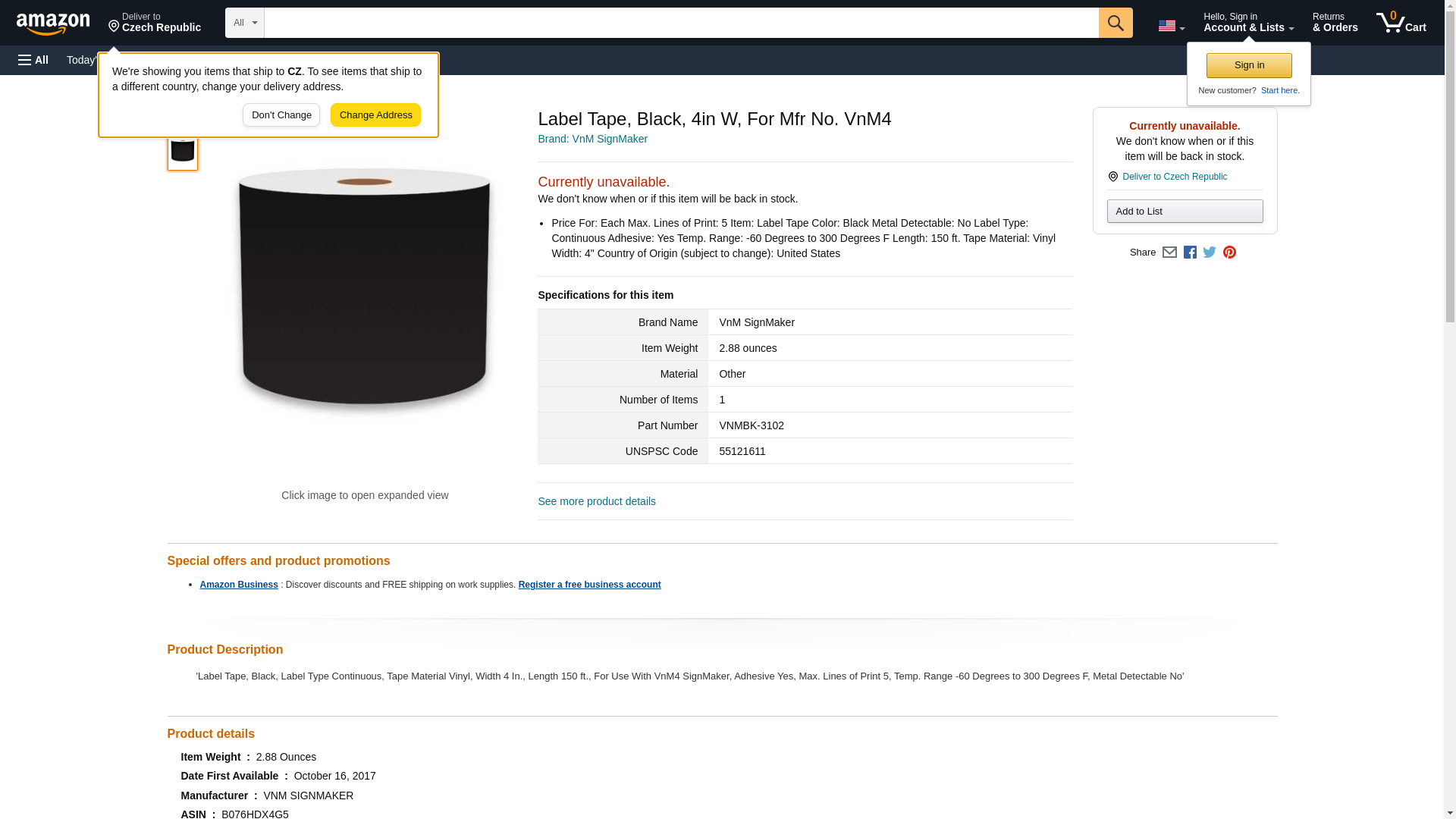 | Feature | <b>Price For:</b> Each <b>Max. Lines of Print</b>: 5 <b>Item</b>: Label Tape <b>Color</b>: Black <b>Metal Detectable</b>: No <b>Label Type</b>: Continuous <b>Adhesive</b>: Yes <b>Temp. Range</b>: -60 Degrees to 300 Degrees F <b>Length</b>: 150 ft. <b>Tape Material</b>: Vinyl <b>Width</b>: 4" <b>Country of Origin (subject to change)</b>: United States |