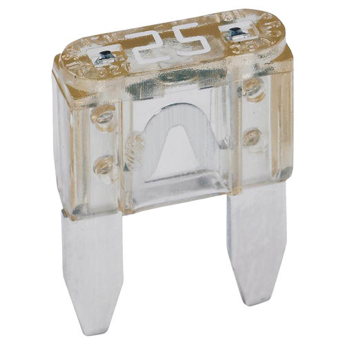 5 Pack, 25A, 32V, Clear, Fast Acting Mini Blade Fuse, Color Coded For Easy Identification Of A Rating & Feature A Transparent Housing For Viewing The Fuse Link Status, Dimensions: 0.076"L x 0.55"W x 0.60"H.