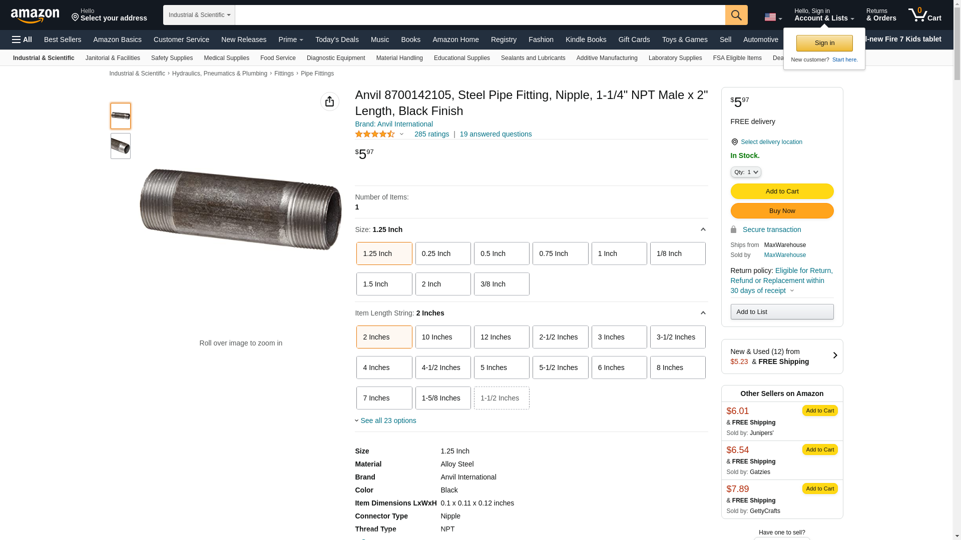 Anvil 8700142105 Steel Pipe Nipple, 1.25 X 2", Black