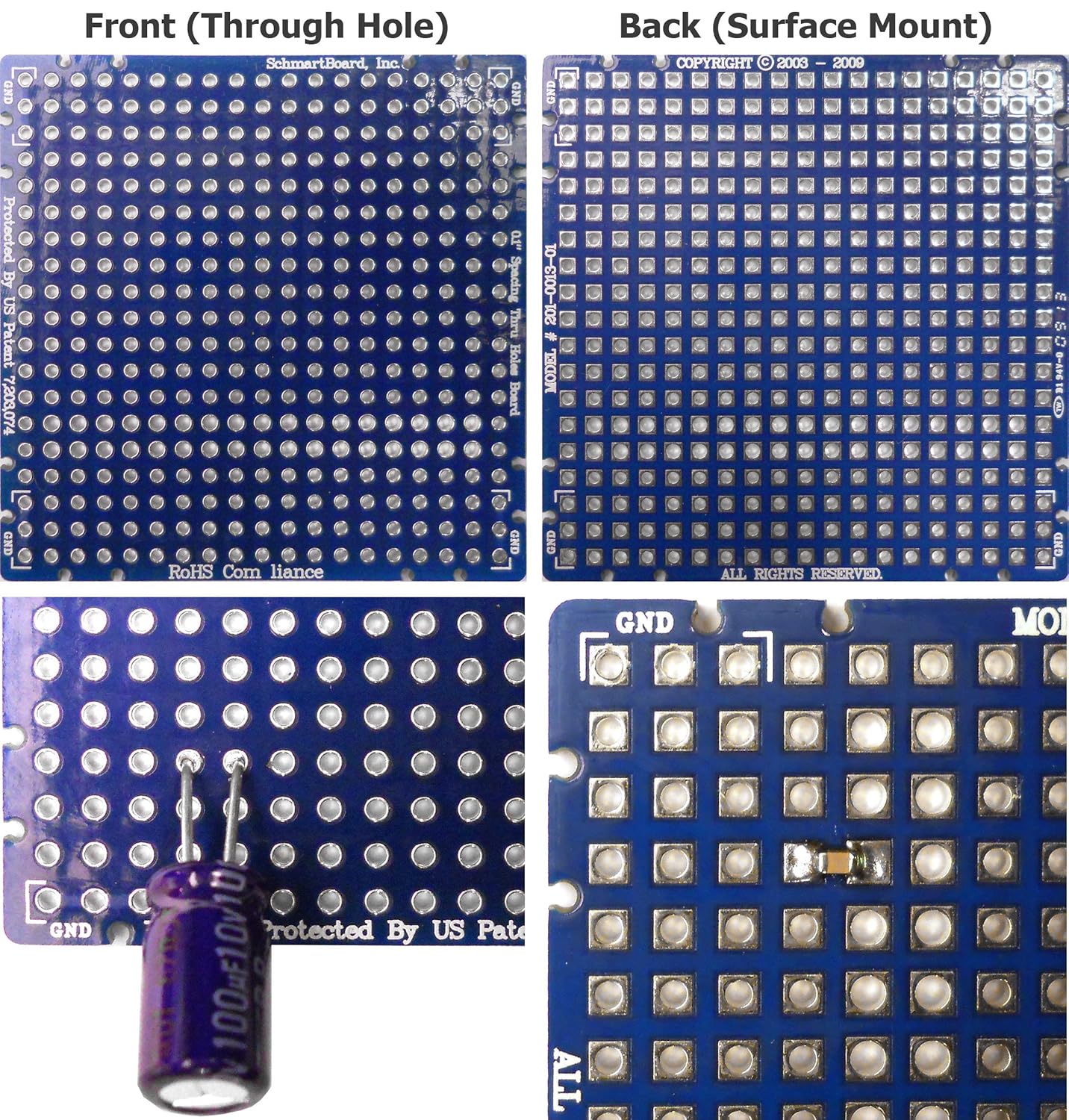 This untraced board has holes that are perfect for through hole components on one side and holes designed for filling in with solder to use for surface mount components on the other side.