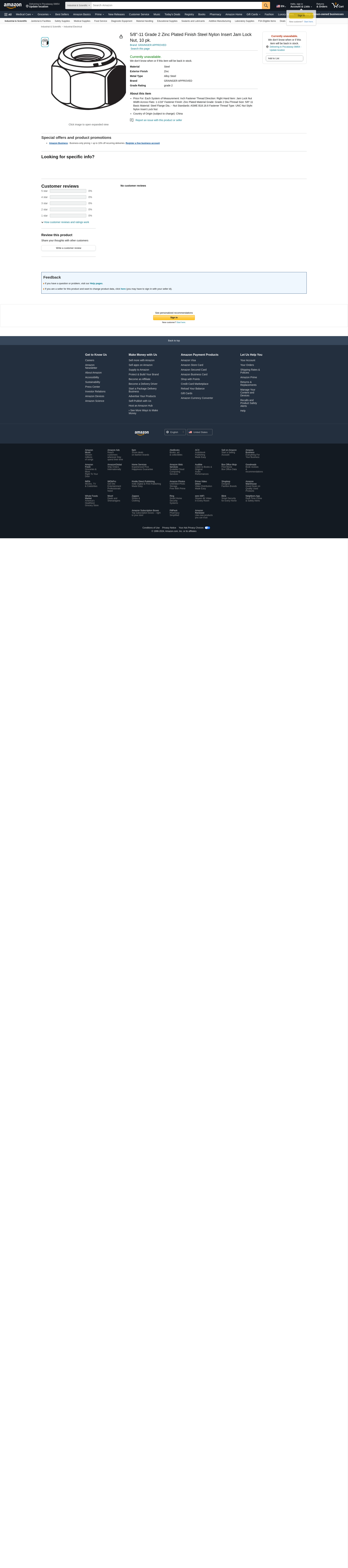 'Jam Lock Nut, Nut Style Nylon Insert Lock Nut, System of Measurement Inch, Steel, Fastener Finish Zinc Plated, Fastener Thread Direction Right Hand, Fastener Thread Type UNC, Dia./Thread Size 5/8 In.-11, Material Grade Grade 2, Width Across Flats 1-1/16 In., Nut Height 39/64 In., Nut Standards ASME B18.16.6, Flange Dia. -, Package Quantity 10'