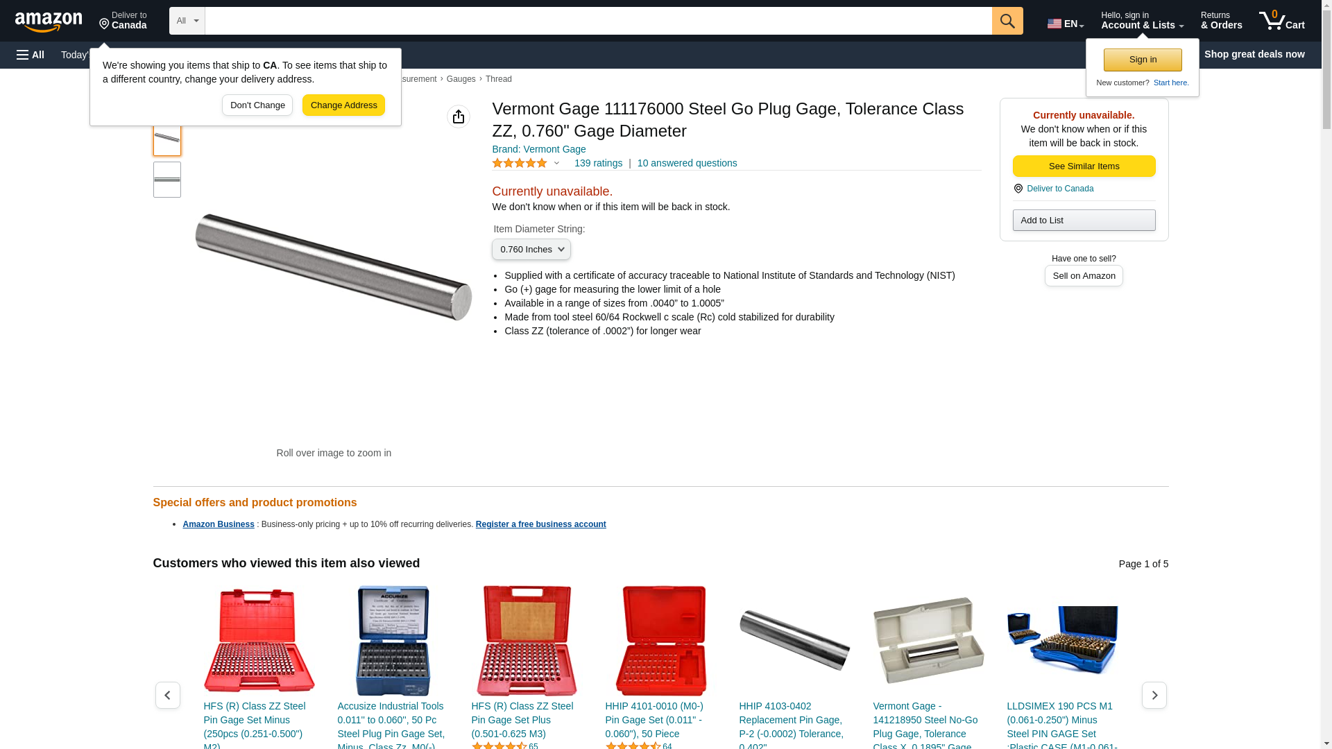 Vermont Gage 111176000 Steel Go Plug Gage, Tolerance Class ZZ, 0.760" Gage Diameter