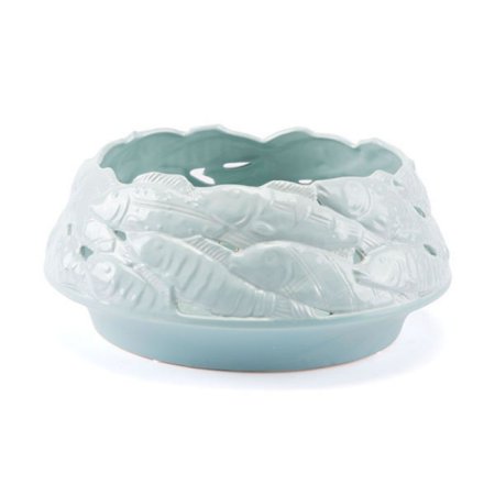 <ul> <li>Inspired by the sea</li> <li>This lovely bowl in soft blue is the perfect coastal accent</li> <li>Use as a centerpiece bowl or as a decorative object on any surface</li> <li>Open design and playful fish pattern make it an eye-catching piece wherever it is placed.</li> <li>Dimensions: w 14.2 x h 6.1 x l 14.2 inches, weight: 9 lbs.</li> </ul>