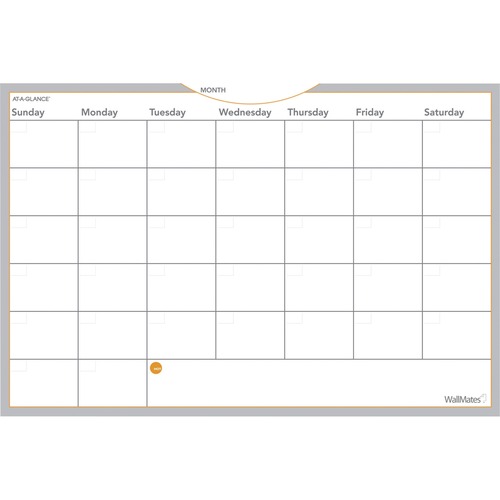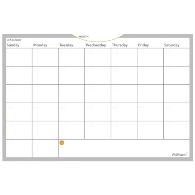Undated monthly format with large daily blocks and HOT Spot reminder notes area. Self-adhesive backing allows you to turn any office wall into an instant planning center -- just peel, stick and you're done. Removable adhesive leaves no residue and won't damage walls. Versatile dry erase surface with marker included. Self-adhesive three-year reference calendar. Size: 36 x 24; Page ColorTheme: GrayWhiteOrange. Part Numbers:AAG-AW602028 KC-AAG WALLMATES SELF-ADHESIVE DRY ERASE MONTHLY PLANNING SURFACE, 36 X 24, WHITE UPC: 038576098985