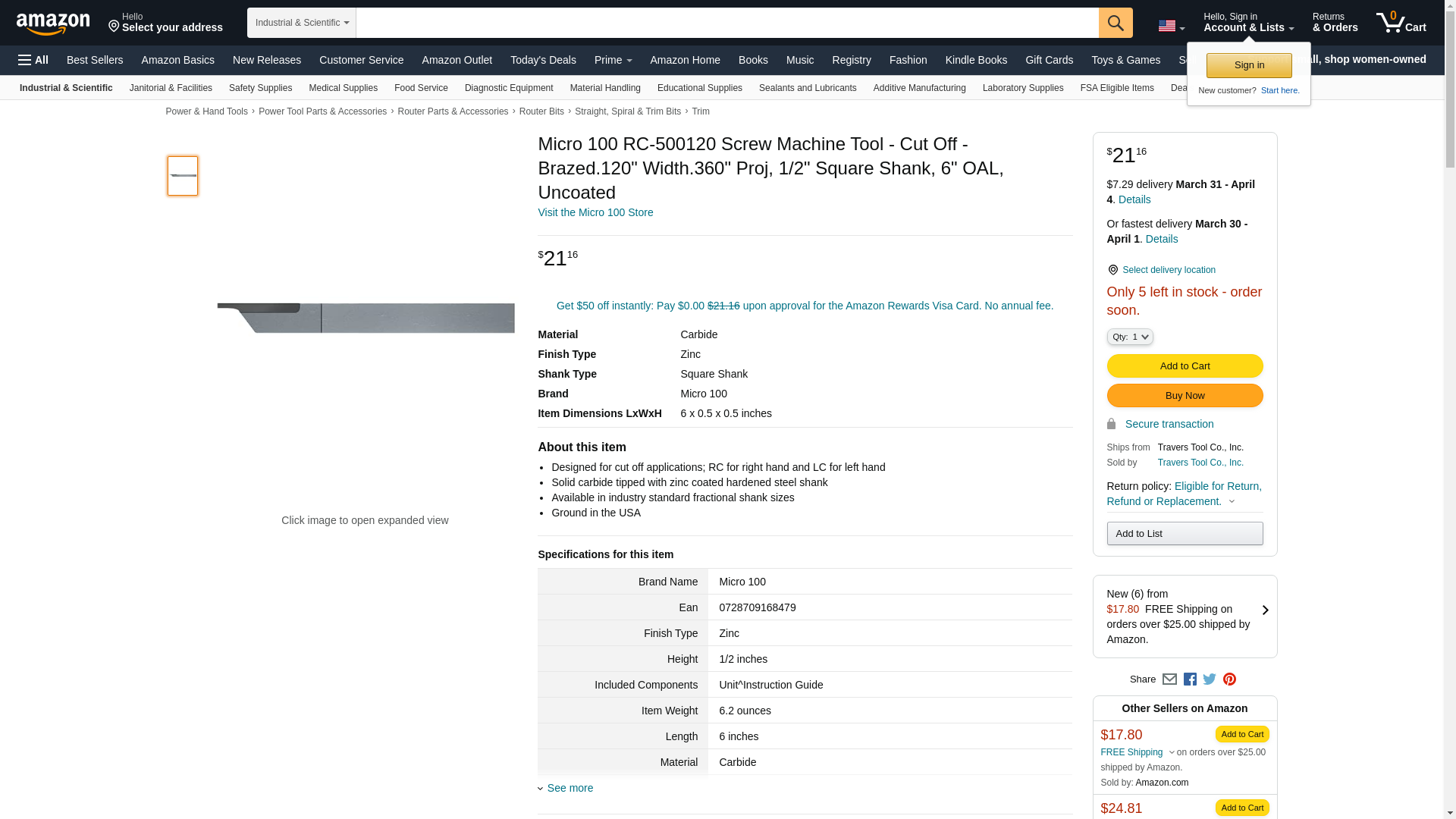 Micro 100 RC-500120 Screw Machine Tool - Cut Off - Brazed, 120" Width, 360" Proj, 1/2" Square Shank, 6" OAL, Uncoated