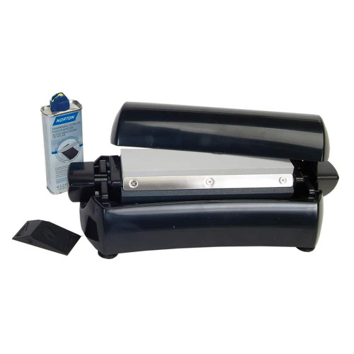 | Feature | Self-contained bench sharpening unit with reservoir for oil and rotating axis that holds three stones in place for sequential use |