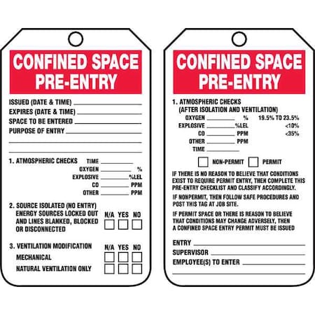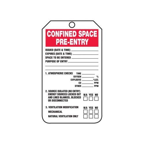 - Permit Tag, Sign Legend Confined Space Pre-Entry Issued Date & Time, Plastic, Tag Size #7 This