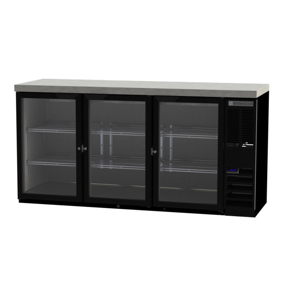 Beverage-Air BB72HC-1-FG-S-27 Food Rated Shallow Depth 2" Stainless Steel Top 3 Glass Doors With Locks Refrigerated Back Bar Storage Cabinet 72"W | Restaurant Equippers