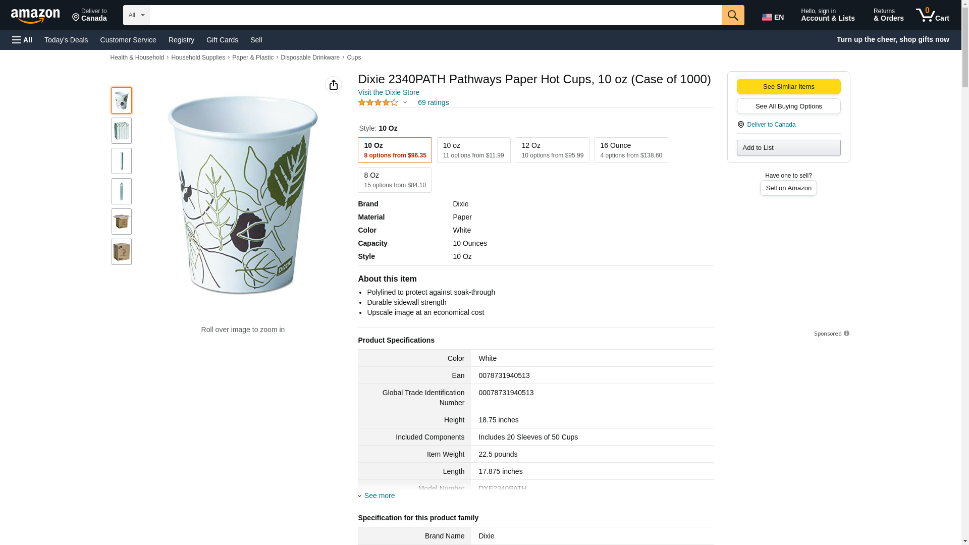 Product Details for Dixie Pathways Paper Hot Cups, 10 oz., 1000/Carton Pathways Paper Hot Cups, 10 oz, 1000/Carton. The polylined design protects against soak-through. Also have durable sidewall strength. Provide an upscale image at an economical cost making them great for specialty hot beverages. This product is made from wood that came from a certified managed forest. Cup Type: Hot; Capacity (Volume): 10 oz; Material(s): Paper; Theme: Pathways. Attention CA residents: Prop 65 Warning → Made in USA This product was manufactured in the USA. Specifications Brand: Dixie Weight: 22.46 lbs Capacity: 10 oz. Type: Hot Cups Material: Paper Color: White/Green/Beige Made in USA: Yes Eco Friendly: Yes