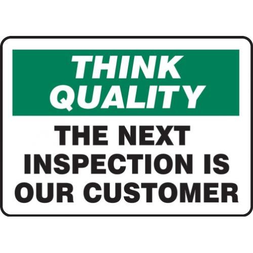 Accuform, MQTL773VA, 7" x 10" Think Quality Safety Sign "The Next Inspection Is Our Customer" Aluminum Features: UV protective coating Withstands splashes and washdowns Endures outdoor environmental conditions Service temperature range: -40 to 250 F Provides the strength of metal, yet never rusts Rounded corners and 3/16" mounting holes on most sizes, will be adjusted for larger sizes