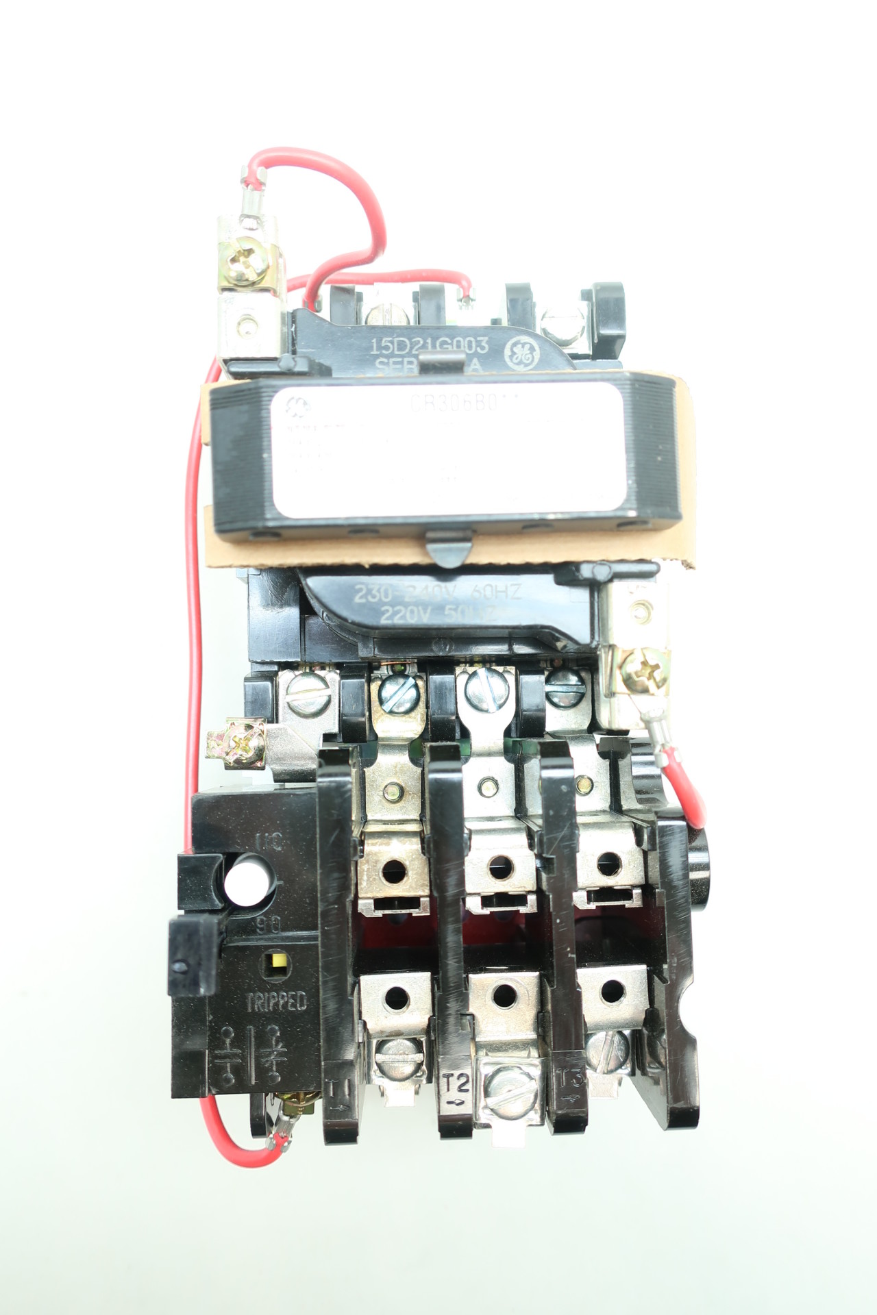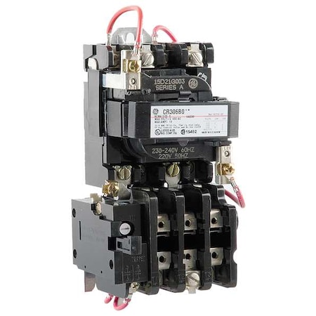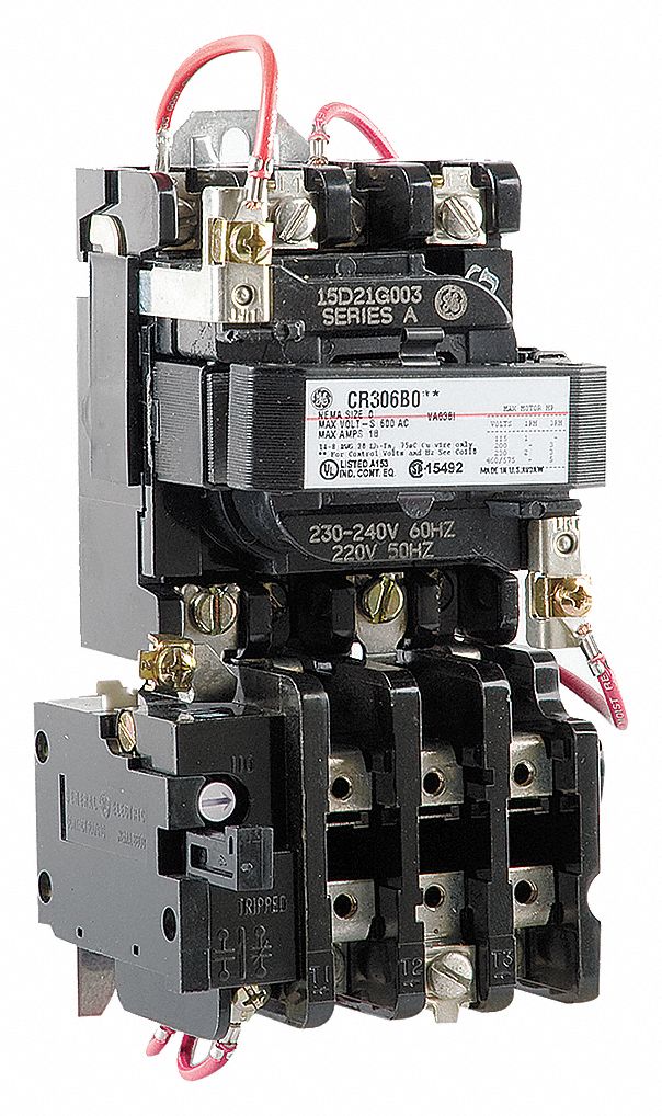 CR306B003 FULL VOLTAGE, NON COMBINATION, NON REVERSING TYPE; NEMA 0 SIZE; 18 AMPERE CURRENT RATING; OPEN ENCLOSURE TYPE; NEMA CONSTRUCTION STANDARD; 220 VAC AT 50 HZ, 230 TO 240 VAC AT 60 HZ COIL VOLTAGE; 3 HP POWER RATING/VOLTAGE; 3 LEG BLOCK (2) THERMAL BIMETALLIC OVERLOAD RELAY MANUAL RESET OVERLOADS; 3 PHASE; GE FASTRAC[T] BRAND; INCLUDES HOLDING INTERLOCK, PRESSURE TERMINAL FOR LINE AND LOAD CONNECTION; CR306 MODEL